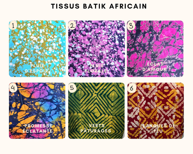 - Imprimés par Aklala Batik qui sort les jeunes filles de leur milieu précaire (maltraitance, prostitution etc) et qui les prend en charge gratuitement pendant 1 à 3 ans pour les former à la couture ou à la teinture du batik.